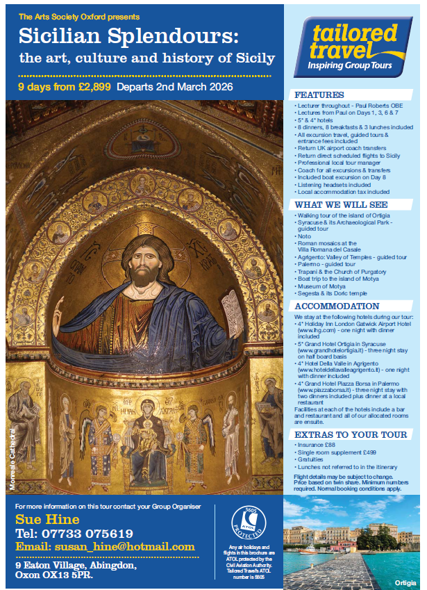 Monday 2nd March to Tuesday 10th March 2026 organised tour to Sicily. See front page of the brochure below. This tour is now fully booked.